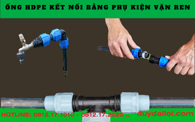 ỐNG HDPE 63 Đệ Nhất kết nối bằng phương pháp dùng phụ kiện vặn ren (phụ kiện ép phun).hoặc kêt nối phụ kiện lắp ngoài tương tự như ống ppr